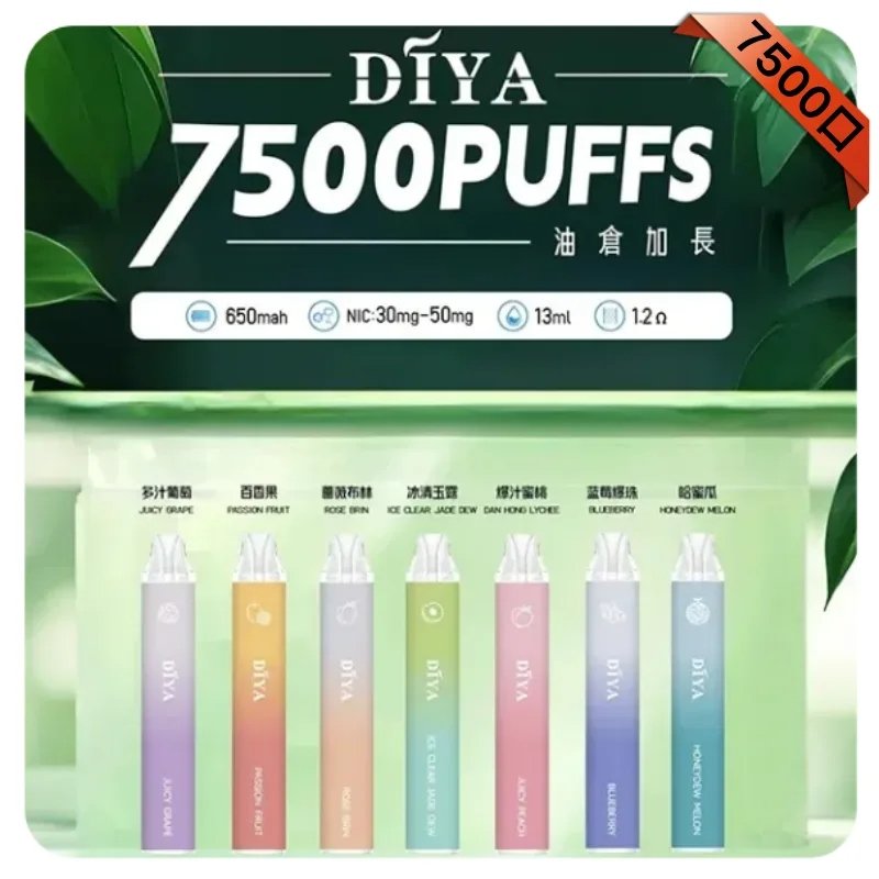 DIYA 叮啞專注於電子菸市場,持續用優惠價格和頂尖技術進行研發,不斷推出新產品和口味,為vape用戶們提供時尚樂趣,在市場上深受口味愛好者的狂熱追捧,現再次新推出叮啞7500口一次性電子煙,内置13ml容量煙油,每一種口味都經過精心調配,保證給您一個最佳的吸煙體驗。且還有市場上未有過的:薔薇布林、冰青玉露兩個口味,感興趣的可以試試。